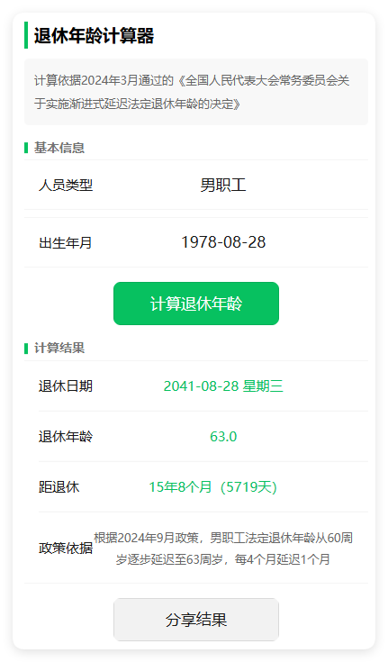 进入计算器后,输入本人信息,即可查询对应的法定退休年龄和退休年月
